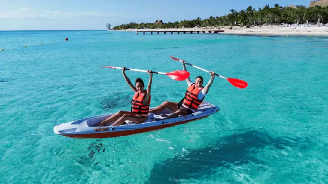 loungers, pristine waters, kayaks, and paddleboards.